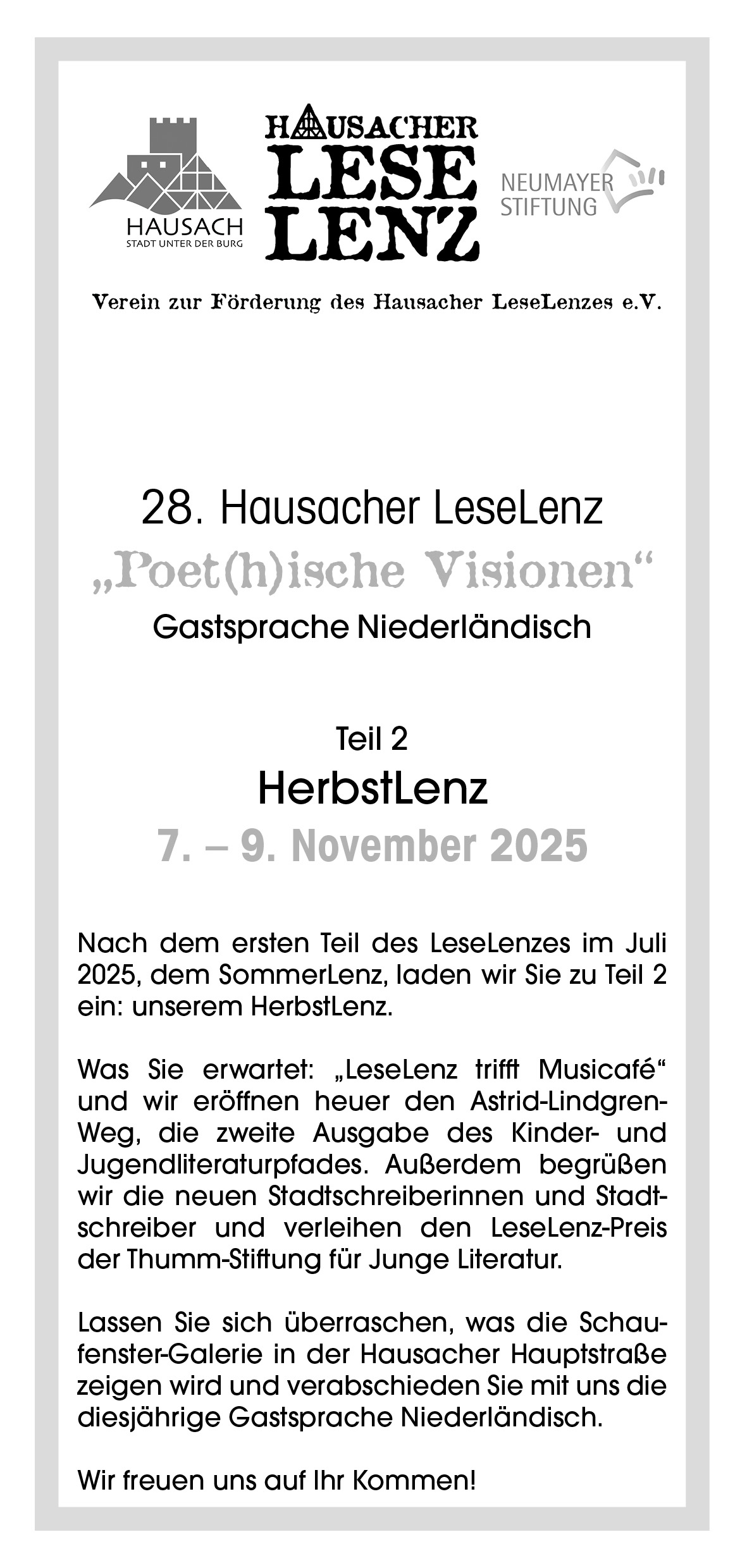 Bald - unsere neue Publikation der Poetik-Dozentur des Hausacher LeseLenzes und der Pädagogischen Hochschule Karlsruhe. Nun schon der zweite Band. Er wird beim HERBSTLENZ vorgestellt: 7. - 9. November 2025 in Hausach.